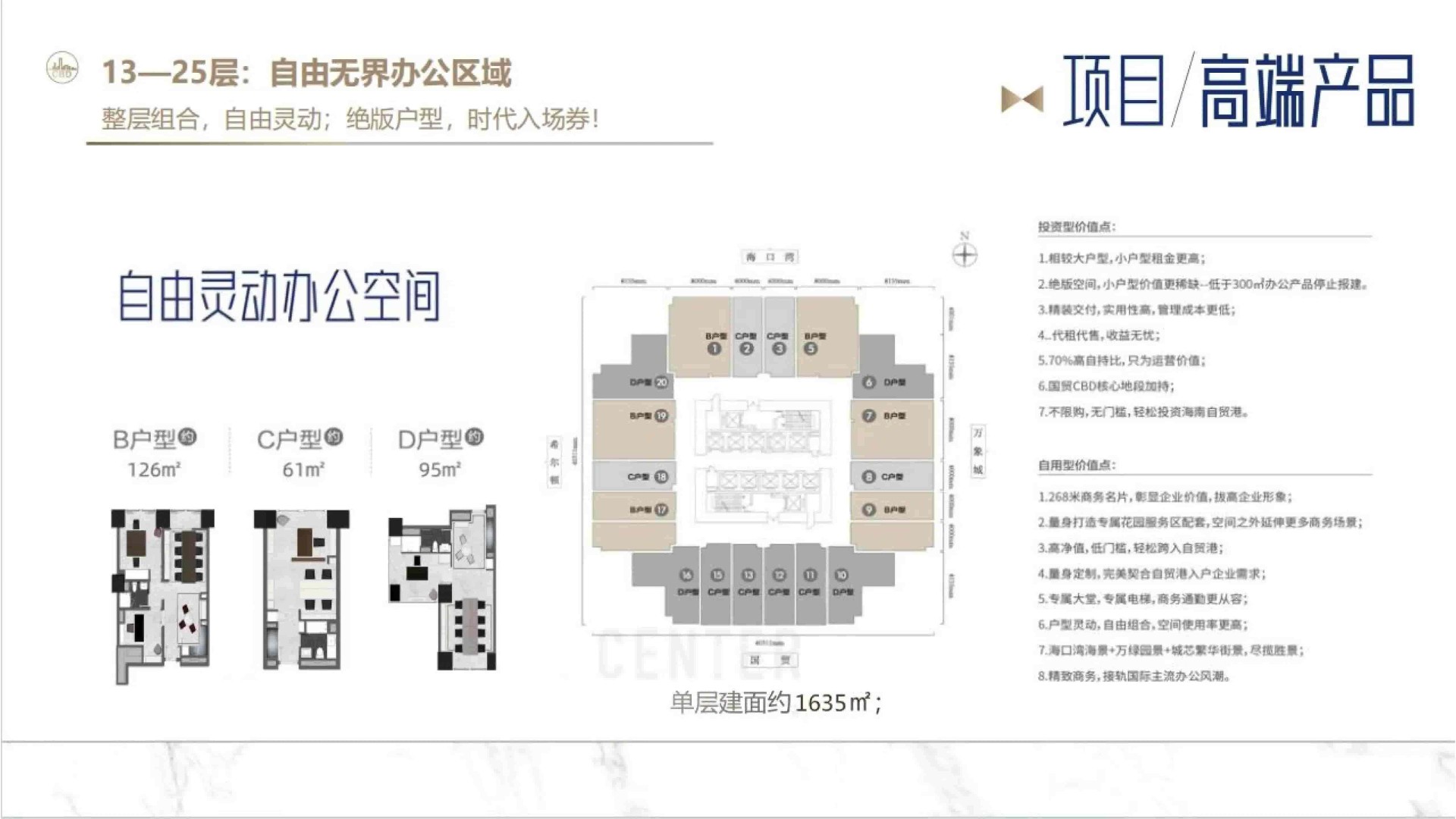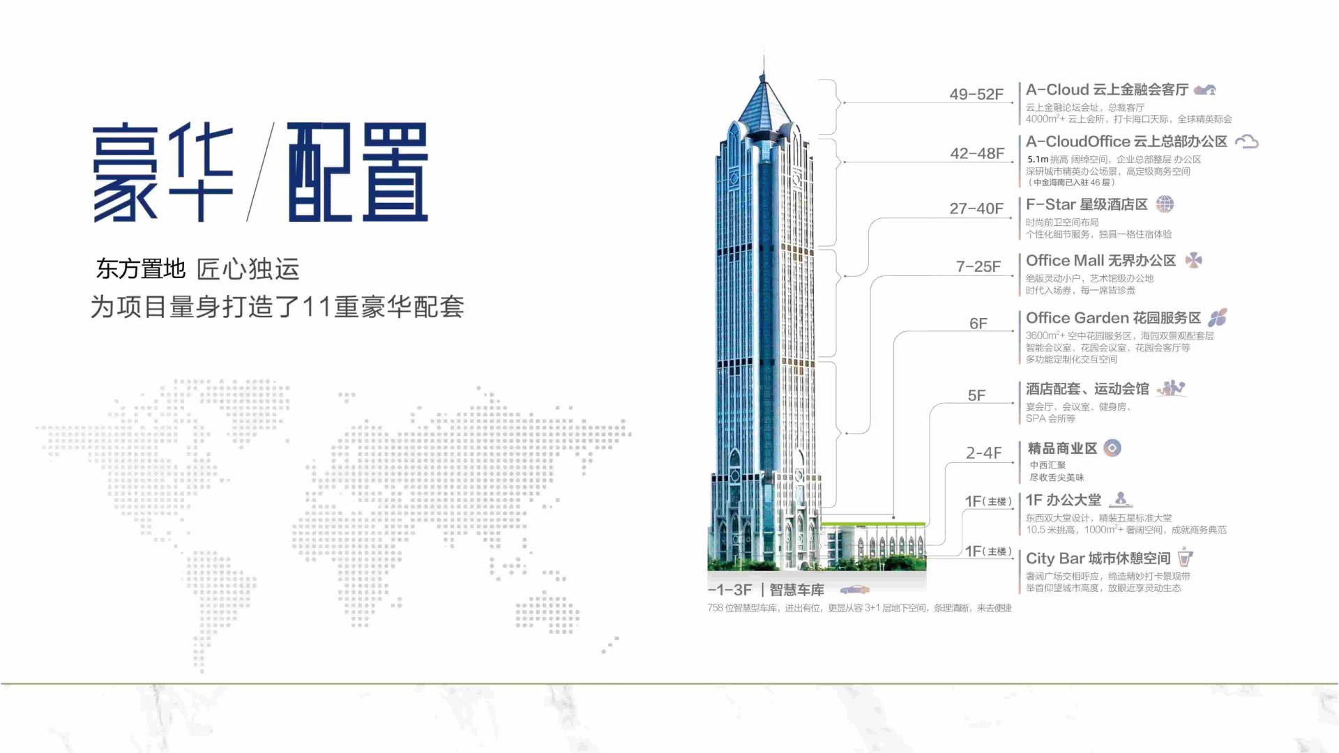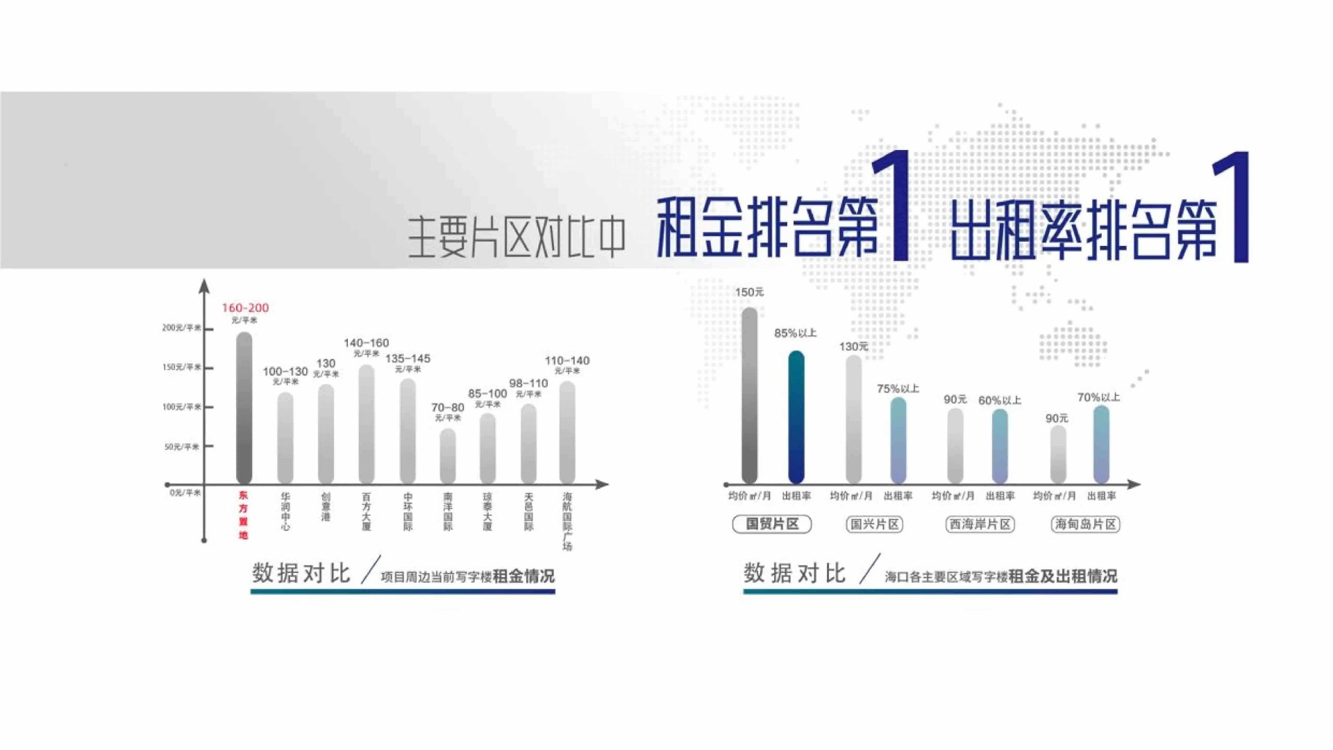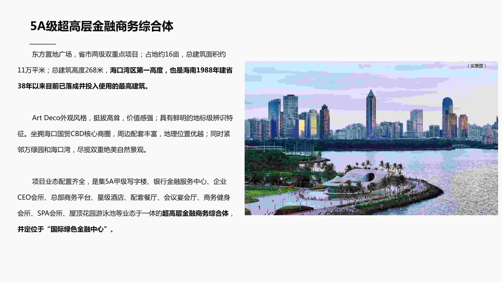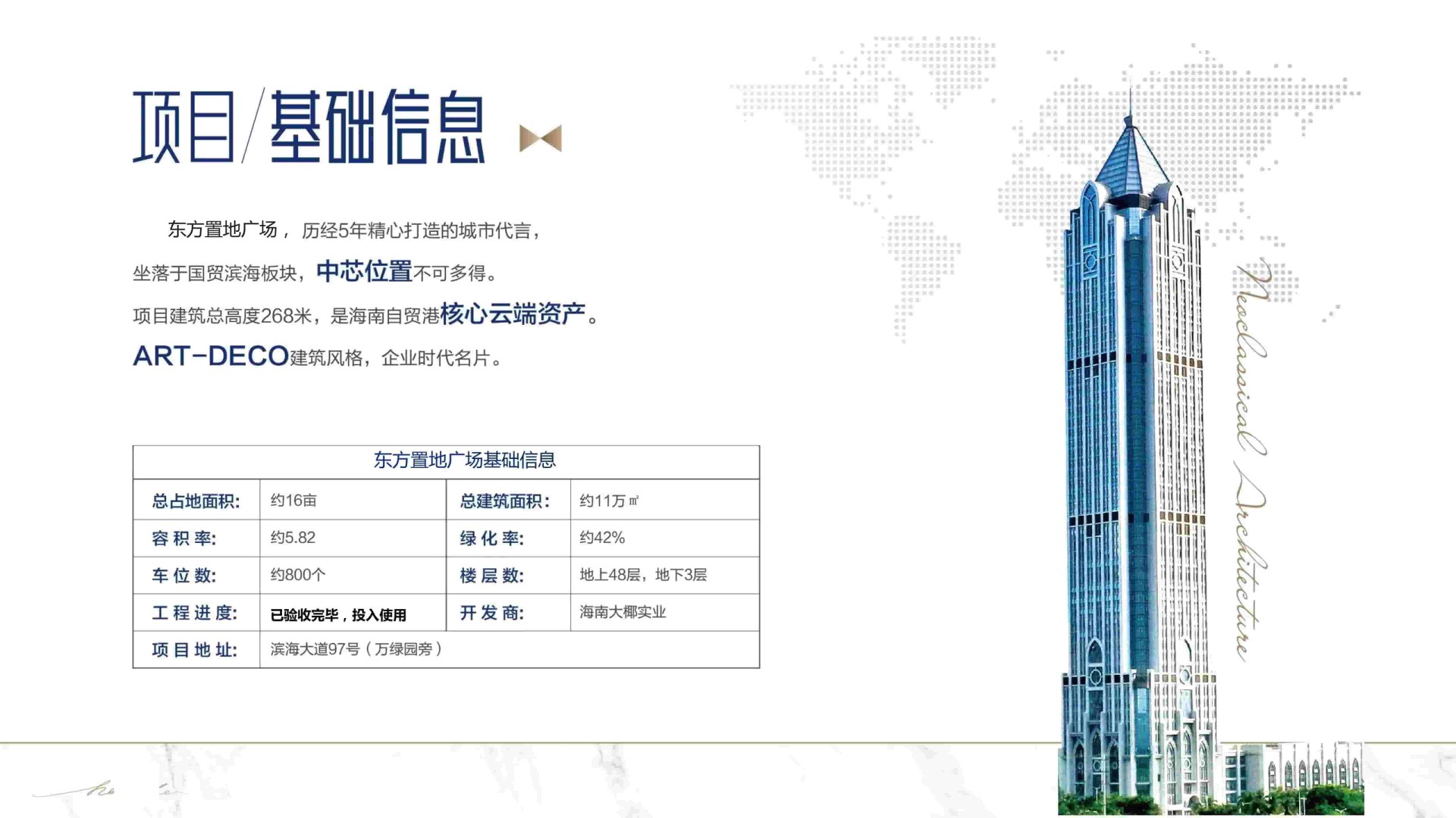 Dongfang Zhidi Plaza, standing at 268 meters tall, is the tallest building in Haikou Bay Area and the tallest building that has been completed and put into use in Hainan Province since its establishment in 1988. The project covers an area of approximately 16 mu, with a total construction area of 110,000 square meters. It has 48 floors above ground and 3 floors underground, with a 50-year property right and about 1,000 parking Spaces. ART DECO style, with extremely high landmark recognition. It is located in the core of the Guomao CBD and is close to Wanlv Garden and Haikou Bay. A super high-rise financial and business complex integrating 5A-grade office buildings, headquarters business platforms, CEO clubs for enterprises, five-star hotels, star-rated restaurants, conference and banquet halls, banks and financial institutions, business fitness clubs, SPAs, rooftop garden swimming pools, etc. Dual key projects at both provincial and municipal levels, targeting world-class enterprises, are committed to building a top-level business platform for the free trade port.